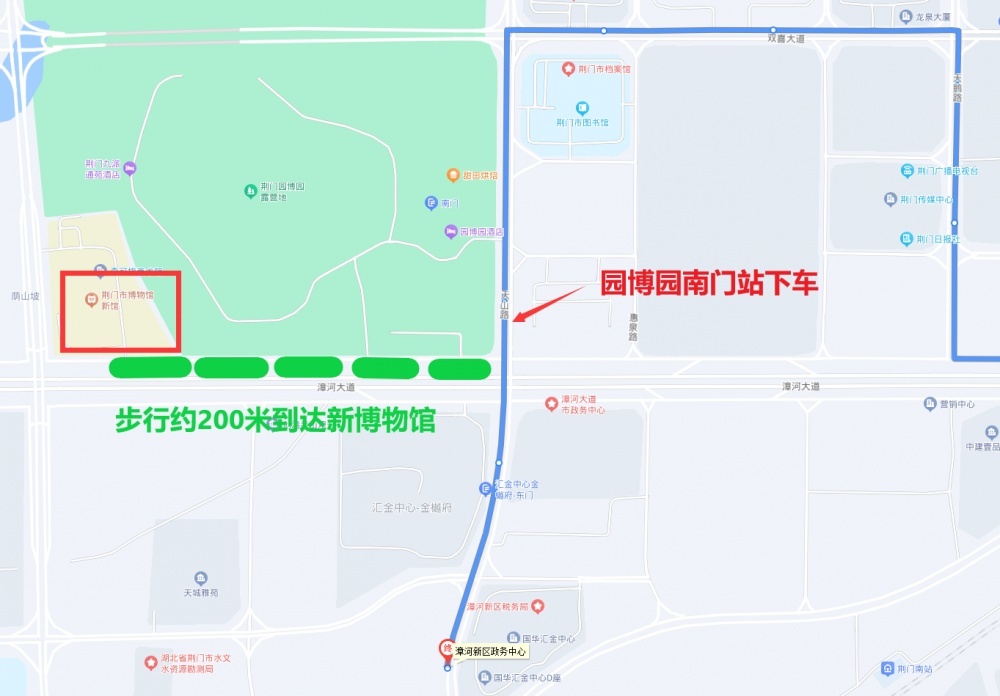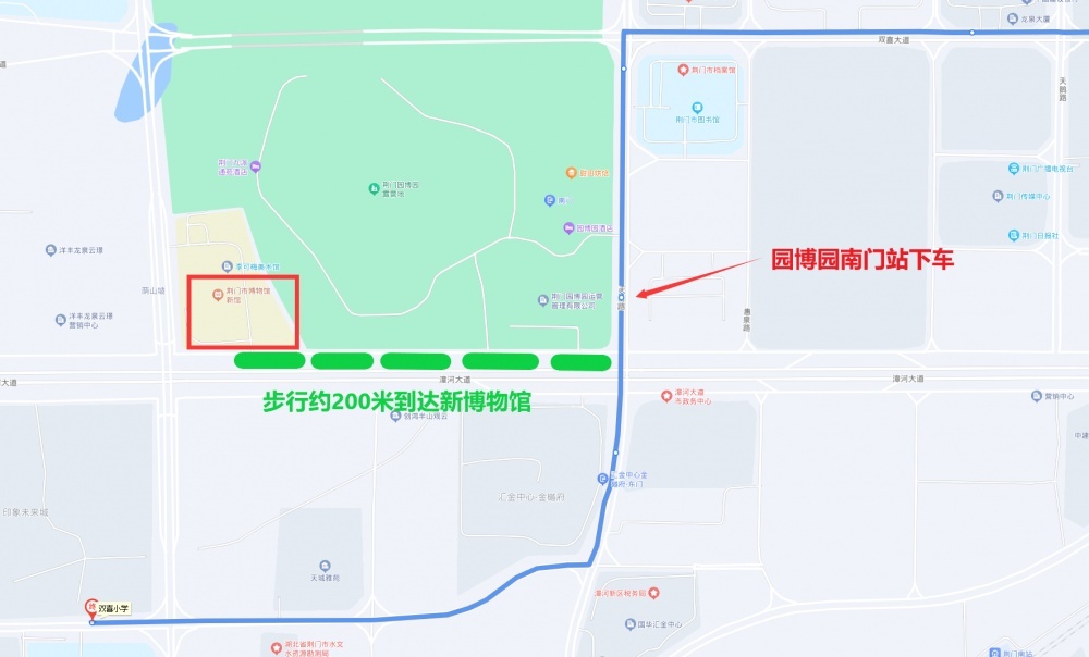 乘坐68路公交車(客運(yùn)北站東—雙喜小學(xué))到園博園南門站下車,然后沿漳河大道往西步行約200米到達(dá)新博物館;68路線運(yùn)營時間6:12-18:20,班次間隔18-30分鐘。