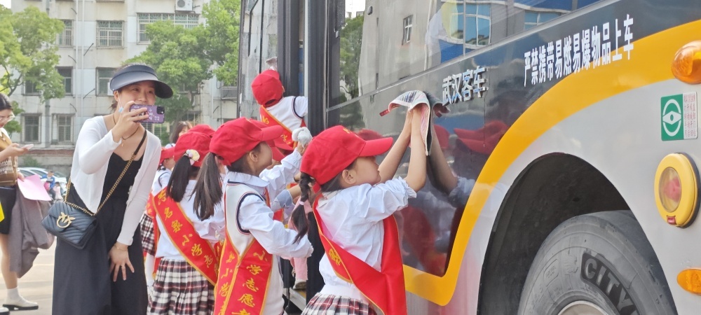 圖/同學(xué)們體驗(yàn)公交車清潔過(guò)程,自備小抹布為車身擦拭水漬,共護(hù)公交出行環(huán)境,倡導(dǎo)綠色出行。