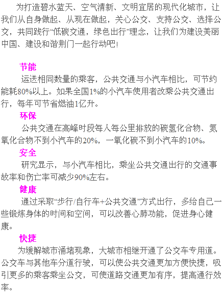 此外,在"公交出行宣傳周"到來之際,荊門公交集團(tuán)公司呼吁廣大車主,請(qǐng)遵守交通規(guī)則,尤其在上下班高峰期時(shí)不要隨意駛?cè)牍粚S玫馈?/p>