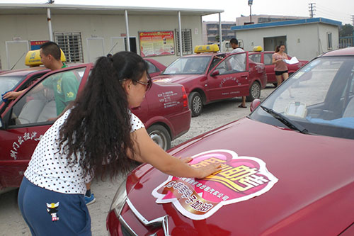 圖5為工作人員為愛心助考車粘貼活動(dòng)標(biāo)識(shí)